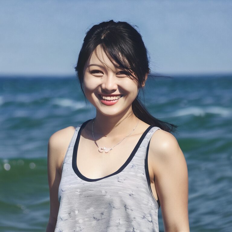 # 背景 ocean, # 人物 1girl, japanese, # 服装 tanktop, # 表情 smile, # 画風 Photograph