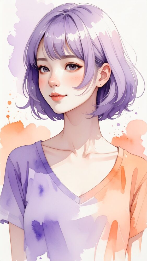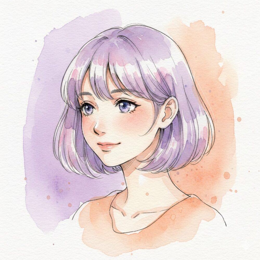 短いラベンダー色のボブヘアの若い女性のセミリアリスティックなアニメスタイルの肖像画。