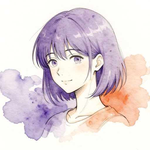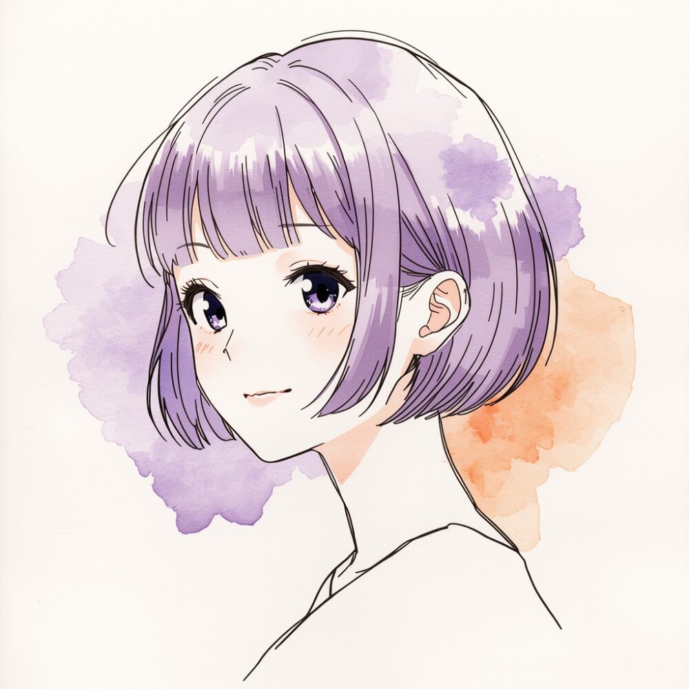 柔らかく優しい微笑み、わずかに横を向いている。バストショット構図。繊細で細い墨線画、手描きの雰囲気。透明水彩画で紙のテクスチャが見える(コールドプレス水彩紙)。柔らかな色のにじみ、不均一なウォッシュ、自然な顔料の粒状感。紫と暖かいオレンジの補色パレット。明るい部分は意図的に塗り残し。ミニマルな背景、紫と桃色の抽象的な水彩ウォッシュ。柔らかな光、穏やかで内省的な雰囲気。完全には仕上げず、絵画的でわずかに不完全な、芸術的な水彩イラスト。