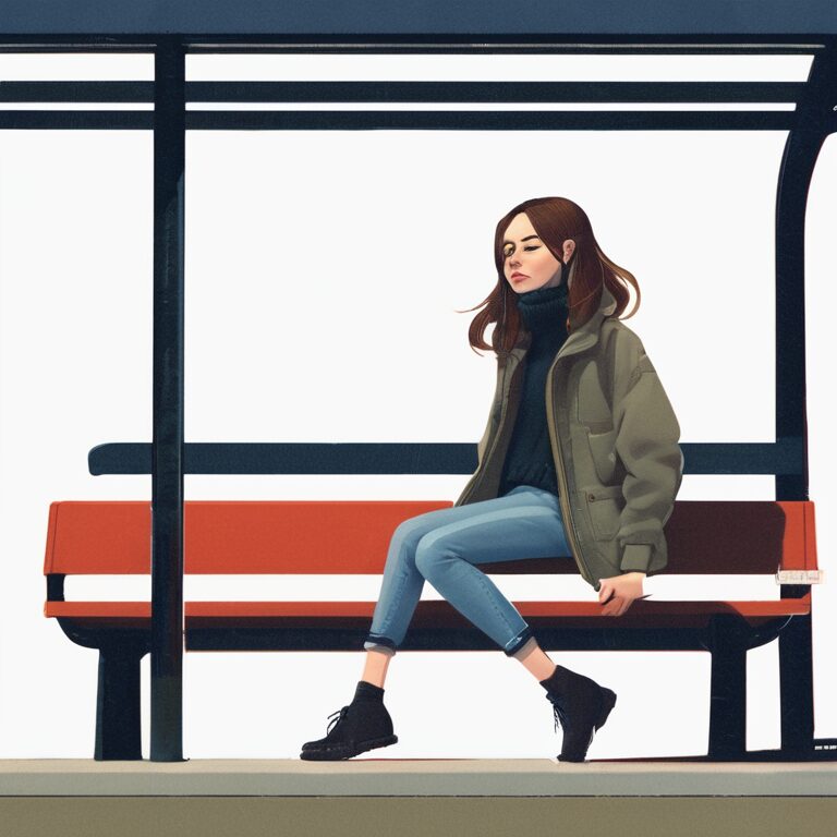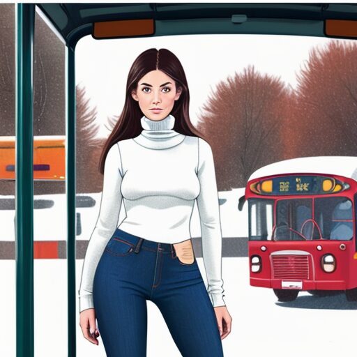 illustration, bus stop, 1girl, turtleneck, jeans, full body, from front,