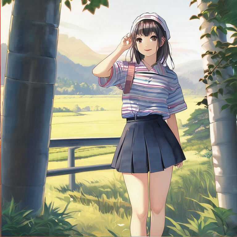 こうなったら、同じSeedのまま、プロンプトを大胆に変更し「ランドスケーブに立っている、ボーダーシャツをきた女の子」でやってみよう。